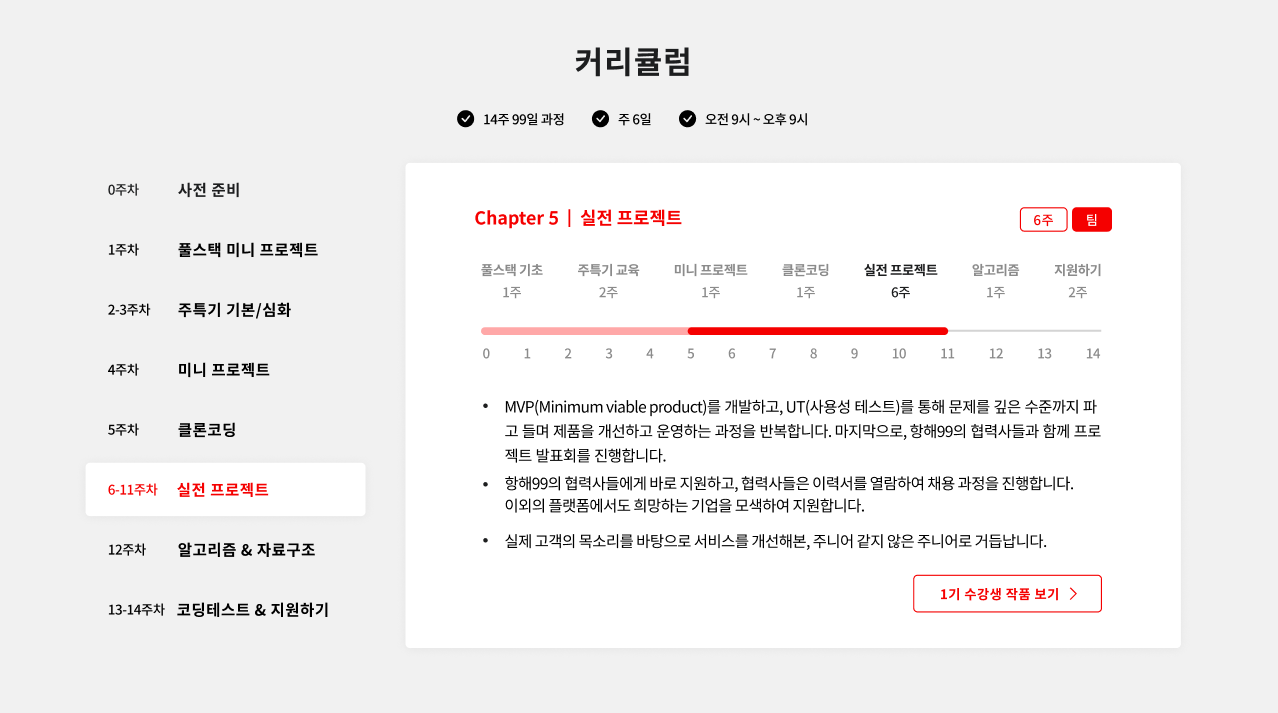 가장 좋았던 것은 프로젝트 횟수가 가장 많다는 점! 총 4번을 진행하는데, 마지막엔 디자이너를 붙여줘서 실전 프로젝트를 진행한다. 수강생들 블로그를 찾아 봤는데, 이게 실제로 사용자 피드백까지 받으니까 만들 때랑 진짜 피드백 받을 때랑 차이가 크다는 말들이 많았다. 또, 부트캠프를 찾다 보니까, 부트캠프 광고들이 엄청 뜨는데, 항해99 광고에서 수강생들 모두 실전프로젝트가 좋았다는 말을 하고 있다. 그래서 나도 진짜 할 수 있을지 궁금해졌고, 취업도 전에 실무를 경험하는 게 큰 메리트인 것 같기도 하고, 전반적으로 많은 부분이 내 기준에 부합해서 항해99도 지원하기로 결정!