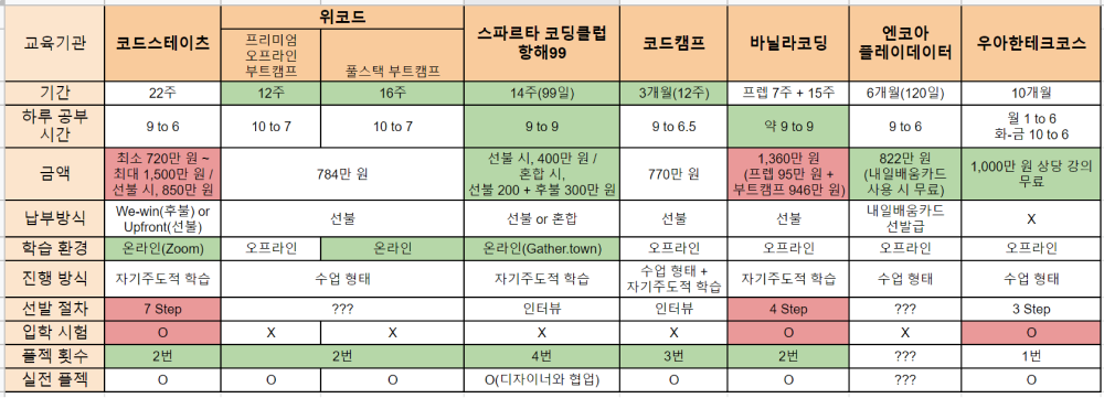 이렇게 총 7군데의 부트캠프를 요약정리해 보았다.