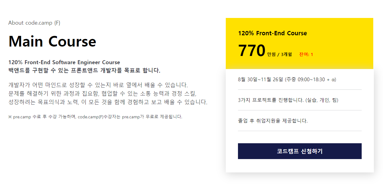 코드캠프는 12주라는 짧은 기간 동안 진행되는 부트캠프이다. 백엔드를 구현할 수 있는 프론트엔드 개발자를 목표로 한다는데, 결국 프론트엔드 개발자를 양성한다는 뜻이다.