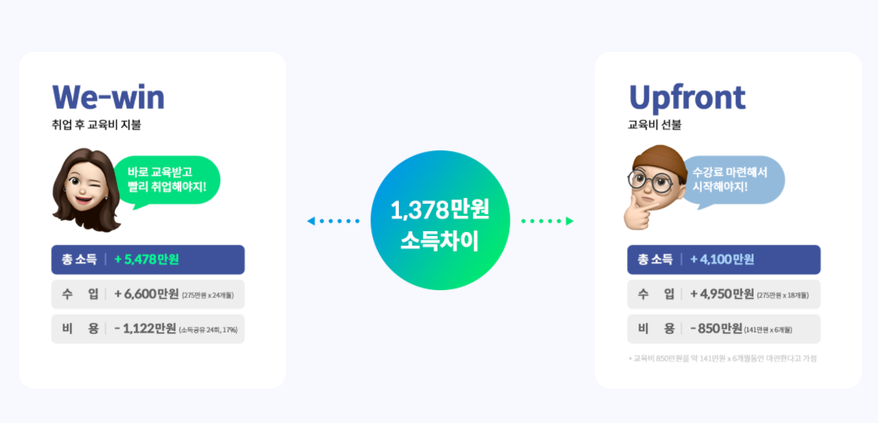 코드스테이츠는 유명한 제도가 있는데, 바로 돈을 취업 시 후불로 결제하는 Wewin 제도이다. 하지만 나는 이게 전혀 장점 같지 않았다. 내 월급의 17%를 2년 동안 낸다? 어후,,, 17%가 적은 것도 아니고, 2년 동안 내는 거면 빡셀 듯,, 최대 1,500만 원까지만 받는다고 하는데, 당연히 더 받으면 안 되는 거 아니냐고... 돈 벌려고 하다가 돈 오히려 떼이는 느낌.