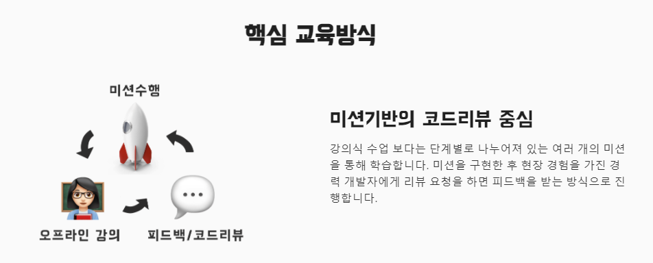 가격은 부트캠프들 중에서 제일 저렴했다. 한 번에 내면 400만 원이고, 혼합이라고 선불 200만 원 내고 후에 300만 원 내면 500만 원인데, 그래도 저렴한 편임.