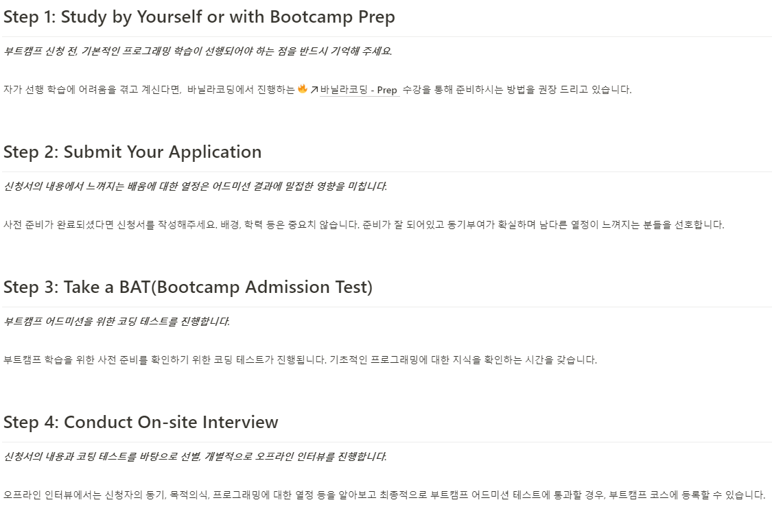 왜 이렇게 결정했는지, 다른 부트캠프들은 어떠한지 하나씩 요약한 내용을 풀어보며 설명하도록 하겠다.