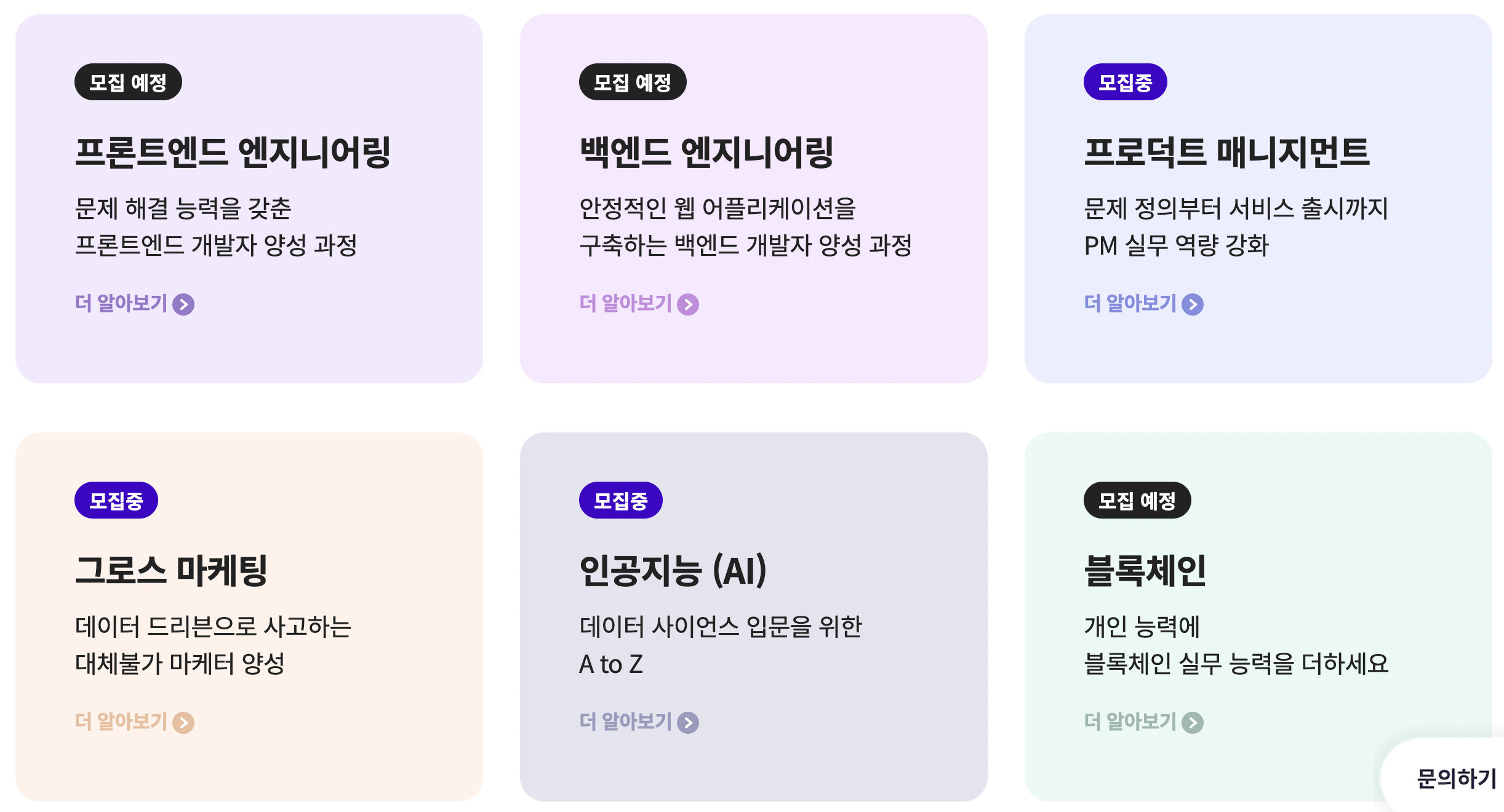 과정도 훨씬 많아졌다. 웹 개발(프론트엔드, 백엔드) 뿐만 아니라 PM, 그로스 마케팅, AI, 블록체인까지. 그런데 과연 이 과정을 듣고 괜찮은 곳에 취업을 할 수 있을지는 모르겠다.(과거의 내가 들었다면 결코 취업이 쉽지는 않았을 듯)