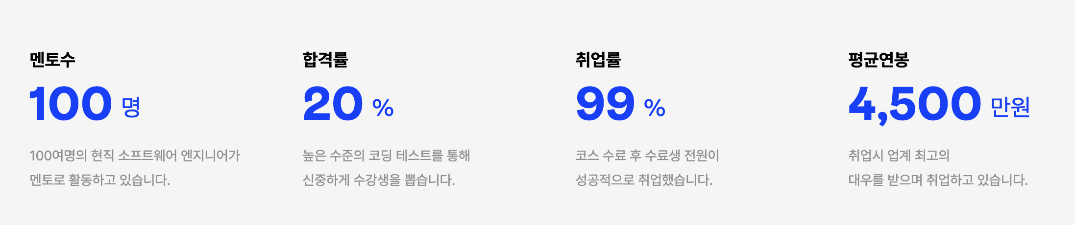멘토수가 압도적이다. 100명이나 되다니. 그리고 합격률도 20%밖에 되질 않는다. 정말로 엘리트 소수정예를 위한 코스임을 확인할 수 있다. 그 대신 취업률은 거의 100%에 달하고, 평균 연봉도 4,500만 원으로 높은 편이다.(그런데 취업률이 한 달 내에도 99%인 건지, 아니면 6개월 기준인지도 명시가 안 되어서 좀 아쉽다. 6개월 이내면 다른 부트캠프들과 별반 차이가 없을 것 같기도 한데,,)